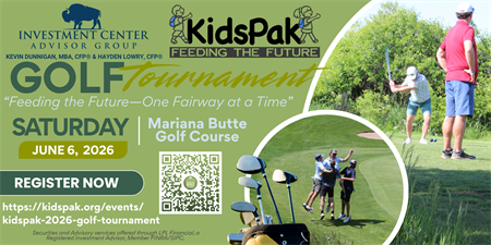 Join us on June 6, 2026, for The Investment Center KidsPak Golf Tournament “Feeding the Future—One Fairway at a Time” as we golf to support over 700 local students receiving weekend food from KidsPak each week.